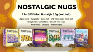 2 for $65 on SELECT Nostalgia Strains, get Nostalgic with Nostalgia. *Strains included: Afghan Skunk, Blue Lobster, Bubba Kush, G-13, Green Crack, Hindu Kush, Honey Banana, Lemon Skunk, OG Kush, Red Congo, White Widow, Uncle Billy, and/or Northern Lights*